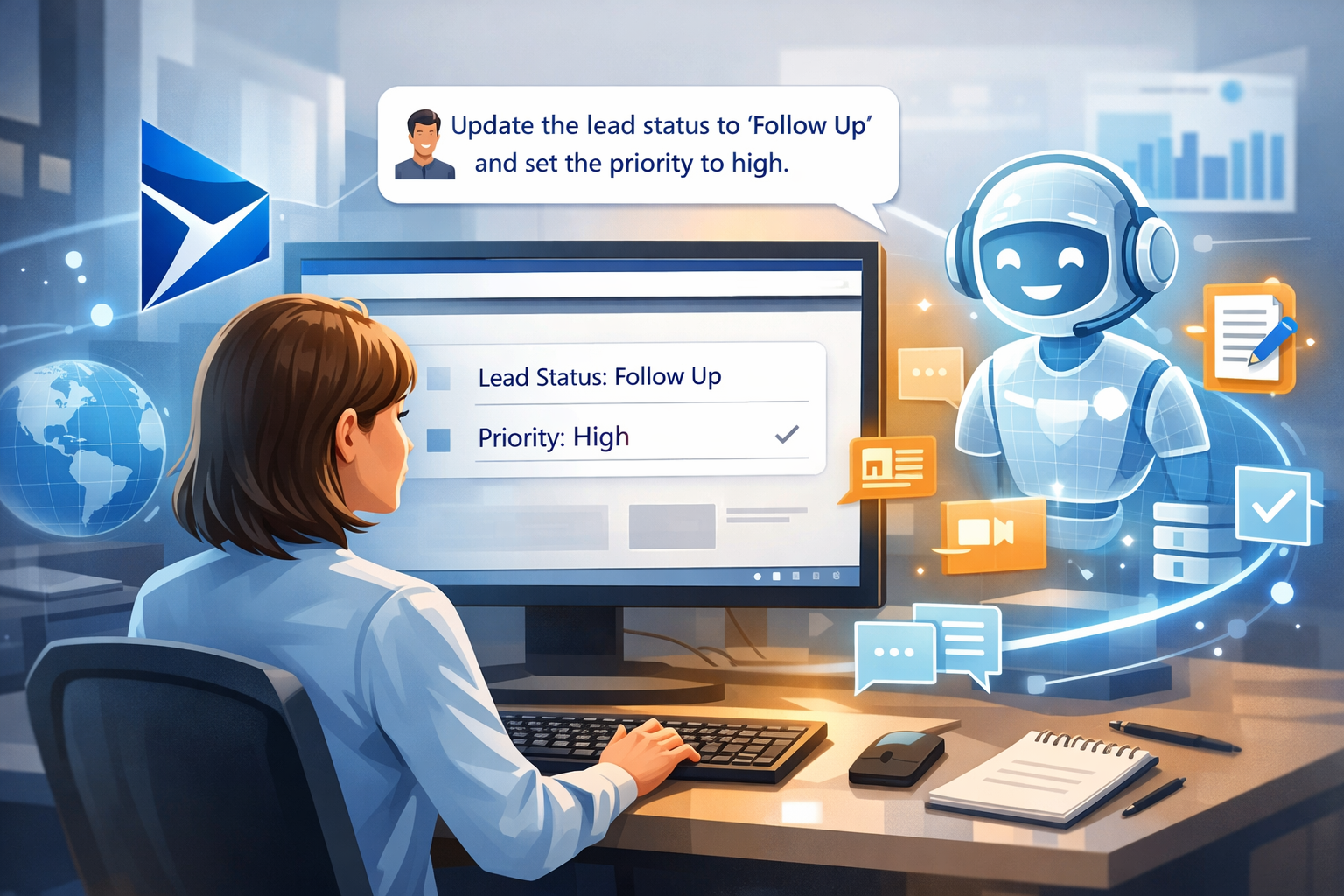Users can update CRM records using conversational prompts with Copilot, reducing manual form entry and improving user productivity.