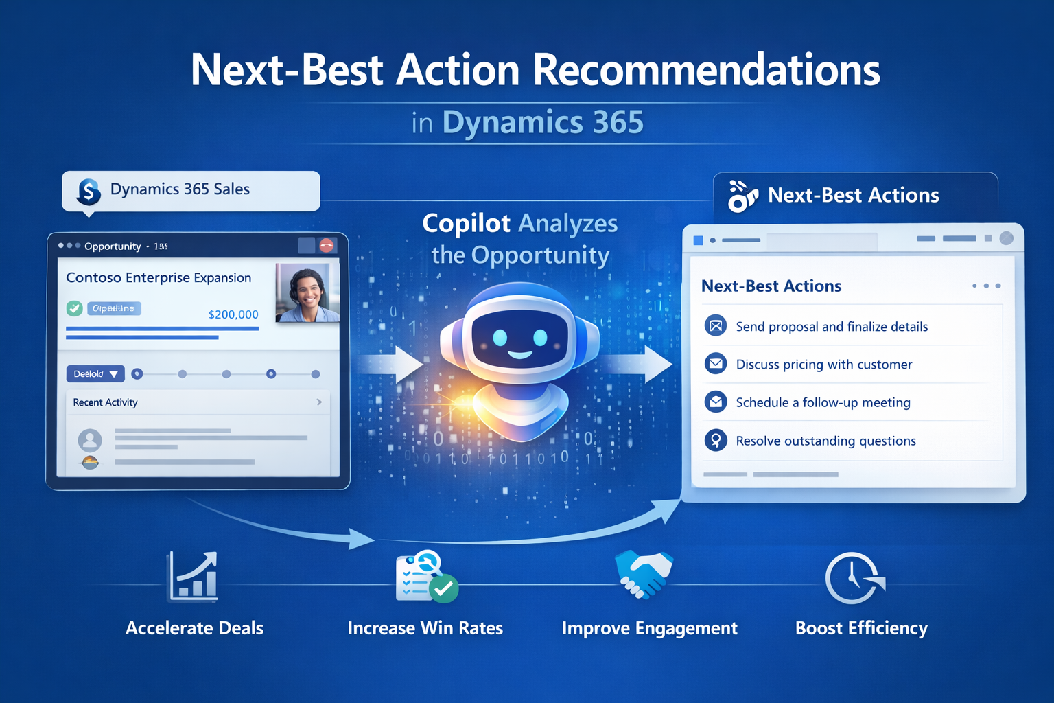 Copilot is deeply embedded within Dynamics 365, allowing users to ask questions, retrieve insights, and perform actions without leaving the CRM.