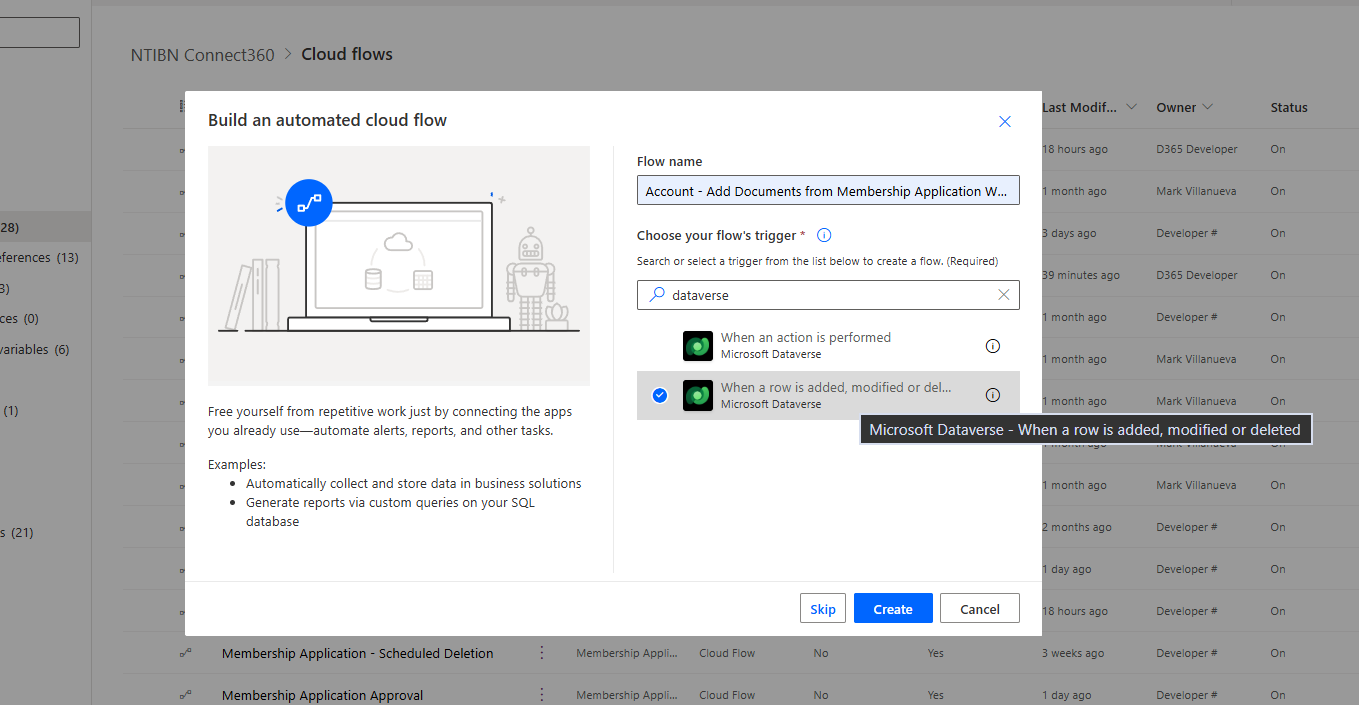 Choose the trigger "When a row is added, modified or deleted" from Dataverse.